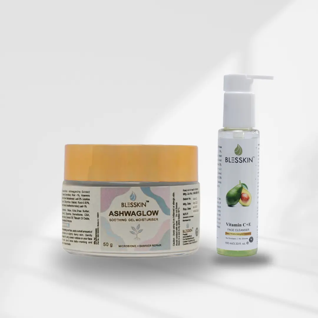 A complete skincare duo for glow and repair! Cleanse away dullness with Blesskin Vitamin C & E Cleanser, then hydrate and strengthen your barrier with Ashwaglow Soothing Gel Moisturiser. Perfect for daily radiance and resilience.